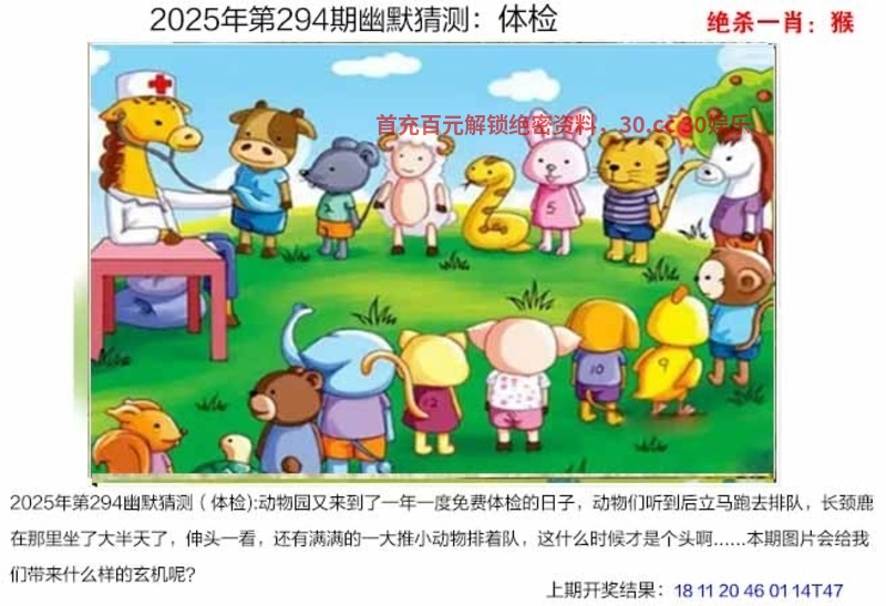 294期图片猜测(体检)【开:鼠18】 动物园又来到了一年一度免费体检的日子,动物们听到后立马跑去排队,长颈鹿在那里坐了大半天了,伸头一看,还有满满的一大推小动物排着队,这什么时候才是个头啊......本期图片会给我们带来什么样的玄机呢? 解:体检解单笔肖鼠猪鸡马蛇龙幽默猜测推荐六肖:鸡鼠龙猪马蛇点击注册30.cc娱乐城3090.com大额无忧 |